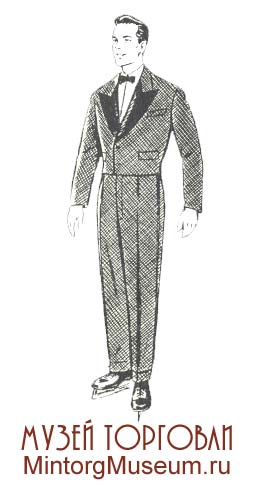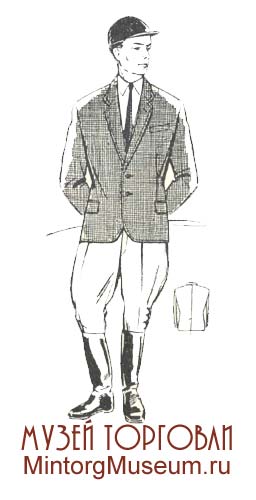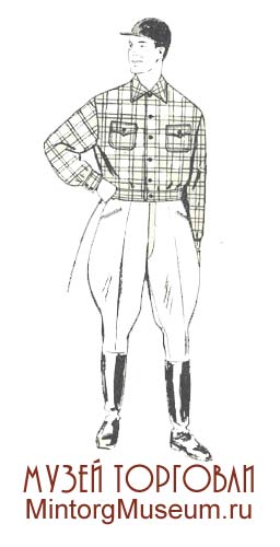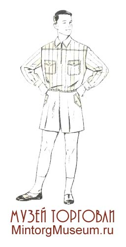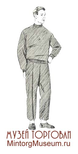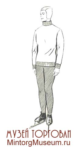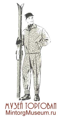 Мужской состоял из рубашки типа лыжной или ковбойки, спортивной трикотажной куртки без рукавов или полурукавки, брюк бриджи, футбольных гетр и лыжной трикотажной шапочки.