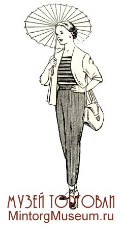 Для худеньких стройных женщин рекомендовали пляжный костюм из гладкокрашеной свободной блузы без застёжки, из-под которой был виден полосатый купальный костюм, и узких брюк соответствующей расцветки. Для удобства брюки на икрах имели молнию.