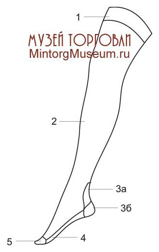 Женские чулки конца 50-х годов состояли из борта (1), наголенка (2), пятки (3), следа (4) и мыска (5).