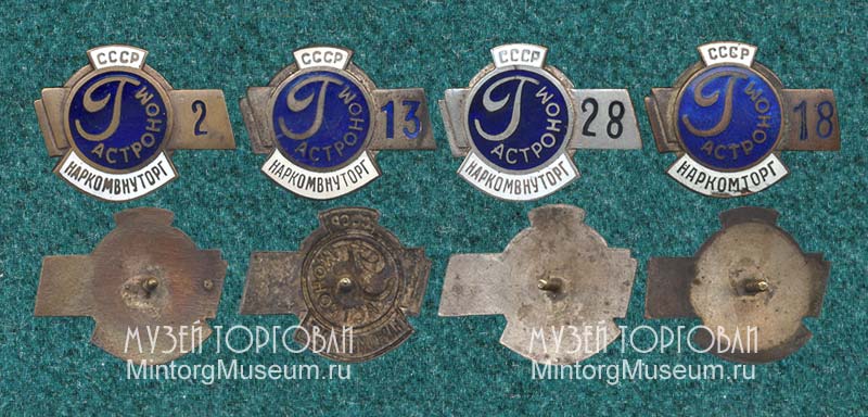 Работники гастрономов обеспечивались нагрудными знаками. На сегодняшний день удалось установить четыре разновидности этих миниатюр, различающихся цветом заливки цифр (первый и третий), контррельефом на реверсе (второй) и изменённым наименованием наркомата (четвёртый).