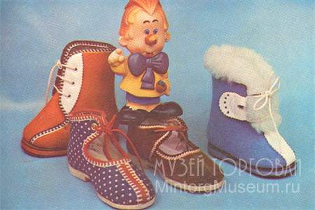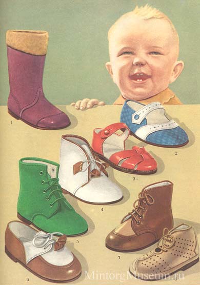 Сапожки-гусарики (2 вида), и туфли малодетские (2 вида). Гуарики - 3 рубля 45 копеек, а туфли - 1 рубль 95 копеек.