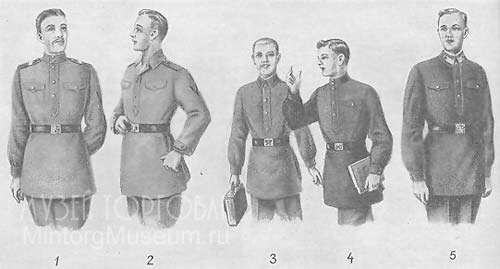 Гимнастерки: 1 — гимнастерка военного образца; 2 — гимнастерка военного образца для жарких районов; 3 — гимнастерка для школьников младшего возраста; 4 — гимнастерка для воспитанников ремесленных училищ; 5 — гимнастерка для работников железнодорожного транспорта