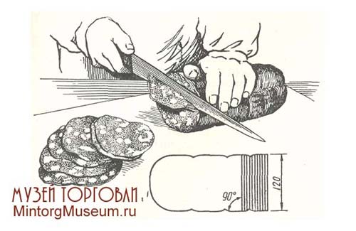 Схема нарезки толстого батона. Толстые батоны режутся под прямым углом к поверхности прилавка (прямая нарезка). Толщина ломтей зависит от плотности колбасы. Чем плотнее колбаса, тем тоньше могут быть ломти
