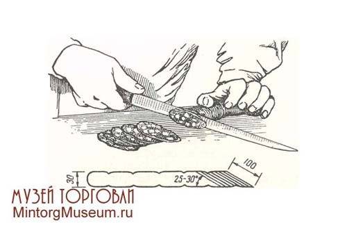 Нарезка тонкого кольцевого батона (кольцевая нарезка). При нарезке всех видов колбасы движения обеих рук должны быть строго согласованы