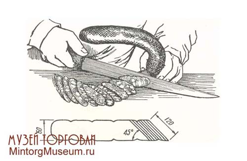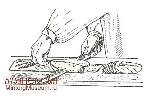 Для нарезки машиной все операции выполняли предварительно. При ручной нарезке кожу окорока срезали по мере продажи; голень оставалась отделенной после того как весь окорок нарезан. Нарезая окорок, продавец держал его за голень. Нарезка прекращалась на уровне коленного сустава. Следовательно, при ручной нарезке процессы разделки и нарезки окорока совпадали и производились по мере продажи ветчины.