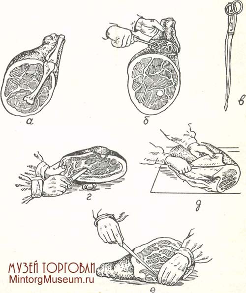 Разделка окорока складывалась из следующих операций: удаление поверхностных загрязнений (зачистка), удаление костей голени (по коленный сустав), удаление бедренной кости, удаление голенной чашки и остатка тазовой кости, снятие кожи, зачистка, выполняемые при помощи двух ножей, струны с двумя кольцами и направляющей их проволоки (струна для удаления бедренной кости применяется по предложению продавцов гастрономических товаров Реунова, Евполова). С её помощью кость быстрее и чище отделяется от мяса. Кожу удаляли только у вареных окороков. Сырые, копчёные окорока и рулеты продавали с кожей.
