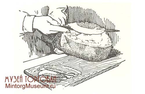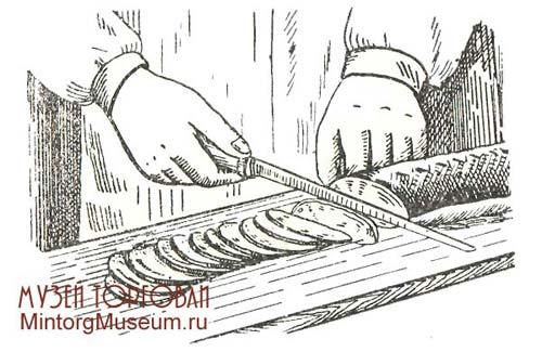 Нарезка прямого тонкого батона. Чем тоньше батон, тем меньше угол нарезки. На рисунке показана косая нарезка, которая облегчает работу продавца, поскольку уменьшает количество ломтей на один и тот же вес