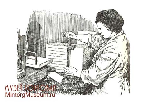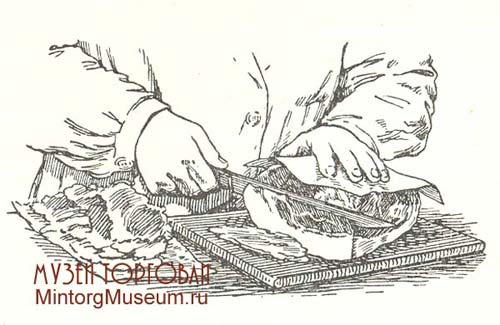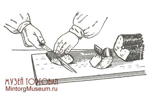 Сливочное масло и молочнокислые продукты следовало отпускать в расфасованном виде. Если не было возможности производить фасовку сливочного масла, то для ускорения отпуска его предварительно нарезали на пласты и бруски, иногда и на куски. Предварительная нарезка масла облегчала и в не¬сколько раз ускоряла отпуск его покупателям. Зачищенное масло размечали и резали струной на пласты, затем на бруски и куски определённого веса — 500 г, 300 г, 200 г. Правильность разметки достигалась соответствующим расчётом толщины пластов, длины и ширины каждого куска, в зависимости от требуемого покупателями веса. Для предварительной нарезки сливочного масла применяли приспособления И. Л. Дворецкого, Ф. И. Подымова, моторную маслорезку конструкции Хорькова. Для разметки масла по способу Дворецкого служила деревянная прямоугольная планка длиной около 34 см, толщиной 2,5x2 см. На каждой стороне планки-разметчика имелись металлические шпильки, расстояния между которыми соответствовали расчету кусков. По длине масло резалось на пять пластов высотой 7,6 см (38 : 5) каждый; по ширине резали через каждые 5,4 см (27 : 5); так же по длине. Получалось 125 кусков по 200 граммов каждый. Если по ширине нарезать масло через каждые 2,7 см, то получится 250 кусков весом по 100 г. Нарезанное кусками масло взвешивалось, завертывалось в пергамент, маркировалось и в фасованном виде подавалось на рабочее место продавца. Приспособление Ф. И. Подымова состояло из двух рядов деревянных брусков толщиной, равной отрезаемому бруску масла. Задние (от фасовщика) концы брусков были соединены вертикальным металлическим стержнем, благодаря которому каждый брусок легко отводится в сторону («открывается», подобно двери). При нарезке первого пласта отводились верхние бруски (или два, в зависимости от нужной толщины), затем струной, скользящей при отрезе по оставшемуся верхнему бруску, отрезался пласт. После того как был отрезан один пласт, отводились следующие бруски по обе стороны монолитного куска масла; таким же порядком отрезали второй пласт и т. д. После нарезки пластов масло перевертывали и также резали на бруски. Маслорезка Хорькова представляла собой машину, которая режет масло рамкой со струнами вначале на бруски и затем на куски. Отпуск фасованного сливочного масла проходил в пять раз быстрее, чем нефасованного. В магазинах, где не было условий для полного внедрения фасовки, ограничивались предварительной нарезкой, которая значительно ускоряла обслуживание покупателей и облегчала работу продавцов. Как и предварительная разделка и нарезка ветчины, колбасы, фасовка масла в больших магазинах производилась специальными работниками — фасовщиками на основе пооперационного разделения труда.