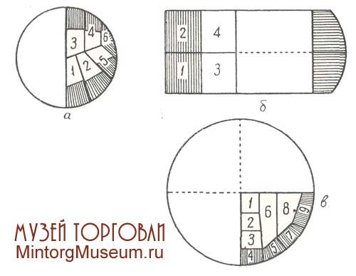 Схема нарезки сыров: а – круглого сыра без предварительной разделки; б – постепенная разделка крупного сыра цилиндрической формы; в – разделка круглого сыра с предварительной нарезкой на четверти
