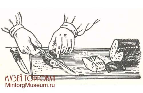 Разделка рыбных гастрономических товаров также характеризовалась определенной последовательностью, применением хотя и очень простых, но удобных приспособлений и инструментов. Например, по инструкции плавники деликатесных рыб срезались на уровне кожи, а по методу С.М. Слобожанкина удалялись с двух сторон вместе с хрящевыми основаниями (если плавники срезать на уровне кожи, не удаляя из тела рыбы хрящей и кости, то они будут мешать при нарезке рыбы). Для этой цели применялся маленький нож, которым удобно удалять и жучки (костную броню) осетровых рыб, шпагаты, планки, снимать кожу. Балыки (спинки) обычно пластовали, чтобы легче и с меньшими отходами удалять кости; от пласта удобнее отнять и ломти нормальной величины. Но пластование целого балыка было применимо только в больших магазинах и в дни повышенного спроса. При небольшом спросе балык предварительно не разделывали и не пластовали — это делалось по мере продажи. Вначале отрезали небольшой кусок, подрезали рёбра, позвоночную кость, затем кусок разрезали пополам вдоль позвонка и удаляли позвонок с рёбрами (от одной половины), снимали кожу и резали ломтями. (также см. Схема разделки рыбы и Рыбные товары)