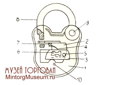 Висячий замок сувальдный однооборотный: 1 — нижняя крышка о приклепанным бортом, 2 — ригельная пластина с отогнутым засовом (ригелем); 3 — сувальда; 4 — пружина сувальды; 5 — ось сувальдного узла; 6 — запорная стойка сувальдного узла; 7 — упорный штифт; 8 — дужка обыкновенная откидная; 9 — ось дужки; 10 — штифт ключевины под трубчатый ключ