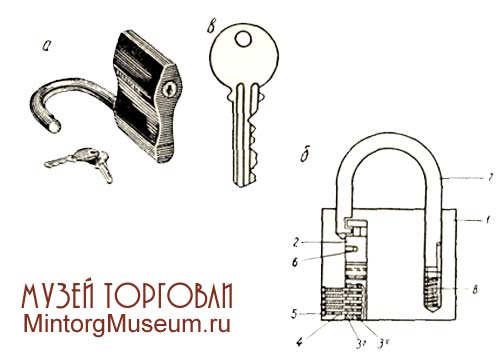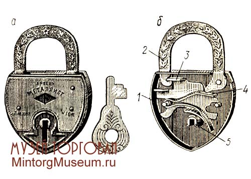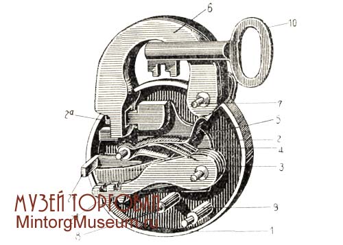 Висячий замок сувальдный двухоборотный: 1 — нижняя коробчатая крышка; 2 — ригельная пластина с ригелем А, ограничителем хода сувальд Б и запорной стойкой В; 3 — сувальды; 4 — пружины сувальд; 5 — распорная желобчатая пружина (регулирует плавный ход сувальдного узла и фиксирует дужку в открытом положении); 6 — дужка (кованая или литая); 7 — ось дужки; 5 — штифт ключевины под трубчатый ключ; 9 — крепежная стойка; 10 — ключ трубчатый кованый сверленый