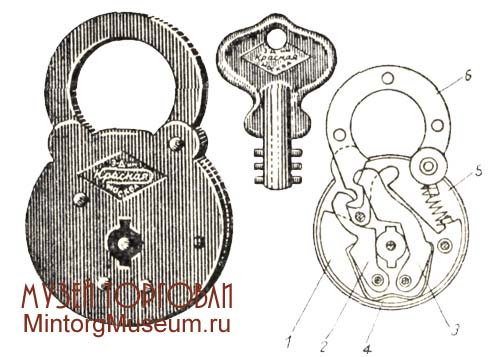 Висячий замок сувальдный полуоборотный типа «Зенит»: 1 — пластина — основание механизма; 2—3 —комбинированные сдвоенные сувальды, непосредственно без ригеля запирающие лужку замка; 4 — пружина парных сувальд; 5 — пружина, автоматически откидывающая дужку; 6 — дужка (склёпанная — пластинчатая)