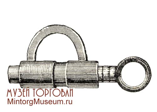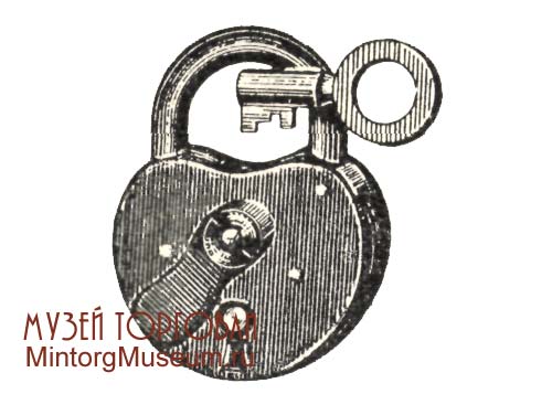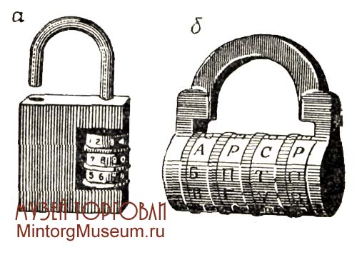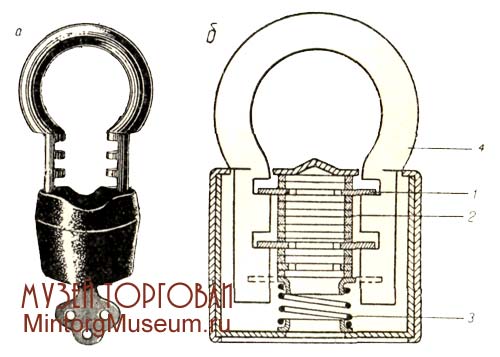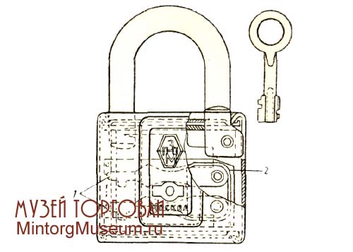 Бессувальдные навесные замки типа «Гирька» характеризуются поворотным ригелем, состоящим из 2—4 одинаковых плоских пластинок с одной выпуклой и одной плоской гранью. Эти пластинки собраны в один блок с прокладками, образующими зазоры соответственно пазам на обоих концах съемной (или выдвижной) дужки. 2 — 4 прокладки, из числа входящих в ригельный блок, изготовляются с узкой щелью в центре (по толщине ключа) и крепятся в корпусе замка неподвижно. Эти прокладки (секретки) позволяют повернуть в замке только такой ключ, который имеет соответствующим образом расположенные прорези на стержне. Замки «Гирька» запираются и отпираются полуоборотом плоского двустороннего ключа, перемещающего запорные (выпуклые) грани ригельных пластинок относительно пазов на концах дужек. Изменение секретности этих замков зависит от изменения расположения секреток, являющихся своеобразными сувальдами. Число серий зависит от коли¬чества секреток и обычно не превышает десяти. 3амок «Гирька» чаще всего изготовлялся с литым чугунным корпусом приведенной на рисунке ниже формы, с фасонной (уширенной сверху) дужкой, иногда со штампованным корпусом овального сечения; последние обычно с прямой дужкой.