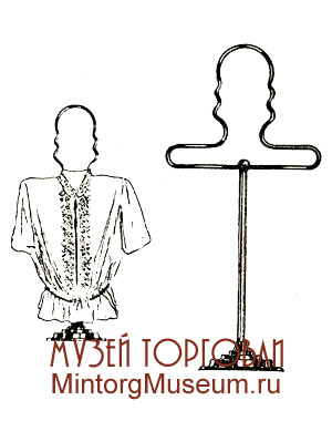Манекены из папье-маше применялись для широкого показа готового платья, головных уборов, белья, чулок. Поворот головки или корпуса манекена, расположение рук и ног создавали впечатление динамичности при показе изделий. Части манекена — бюст, головка, нога, рука — применялись для показа блузок, головных уборов, обуви, чулок, перчаток. Рекомендованная конструкция подставки, заменяющая дорогостоящий манекен для женского верхнего платья, показана на рисунках.