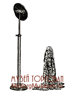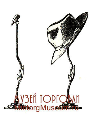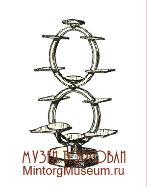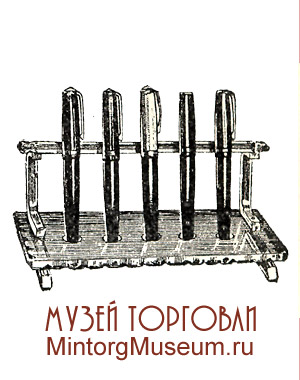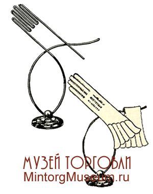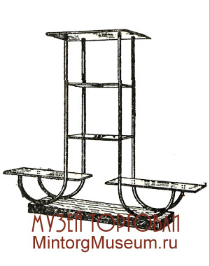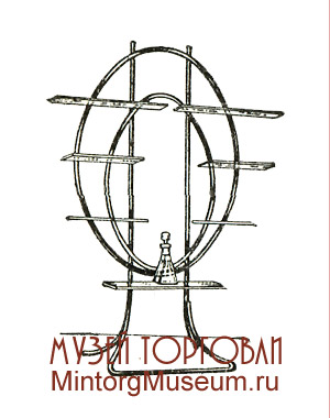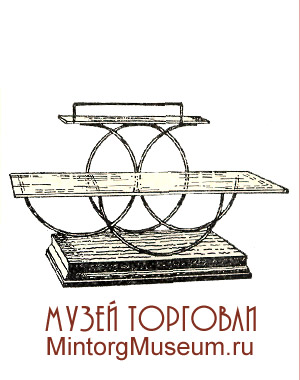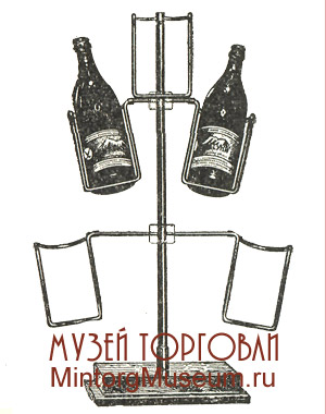Показ ножевых изделий, скобяных изделий, металлических инструментов и разных мелких предметов производился на фанерных щитах, обтянутых тканью. На рисунке показана подставка для шампанского, вин и минеральных вод.