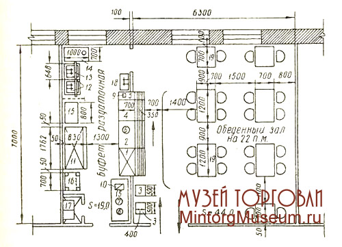 1 — охлаждаемый прилавок для холодных закусок,- 2 — прилавок для горячих блюд (сосиски, яичница); 3 — стол для подносов; 4 — прилавок для хлеба и приборов; 5 — стол для кассы; 6 — электрососисковарка 9СВ-2; 7 — электрокофеварка ЭКВ-2; 8 — электрокипятильник КНД-16; 9 — кассовый аппарат; 10 — электроплита; 11 — холодильный шкаф Т-125М; 12 — моечная ванна; 13 — кассета для сушки посуды; 14 — стол для сбора остатков пищи; 15 — столы производственные; 16 — стол-шкаф для хлеба; 17 — шкафы для одежды; 18 — раковина производственная; 19 — столы обеденные со стульями