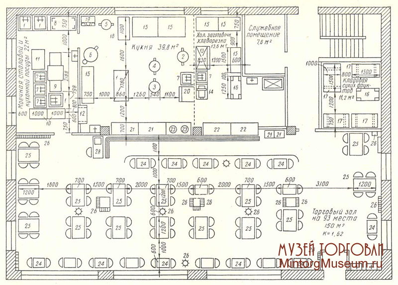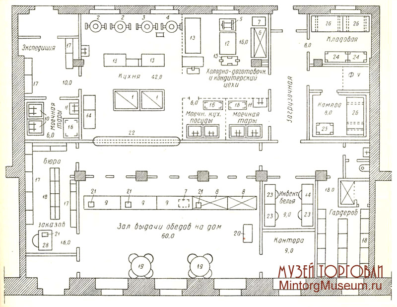 1 — электроплита; 2 — электросковорода; 3 — электрокотёл; 4 — электрокотёл; 5 — универсальный привод на передвижной тележке; 6 — холодильный шкаф; 7 — фреоновый агрегат; 8 — охлаждаемый прилавок-витрина; 9 — прилавок для выдачи обедов на дом; 10 — производственная витрина; 11 — производственная витрина; 12 — стол с деревянной крышкой; 13—14 — столы производственные; 15 — стеллаж передвижной; 16 — стеллаж металлический; 17 — шкаф для судков; 18 — шкаф индивидуальный; 19 — стол; 20 — упаковочный стол; 21 — кассовый аппарат; 22 — раздаточное окно; 23 — шкаф инвентарный; 24 — стеллажи; 25 — стеллажи; 26 — подтоварники; 27 — подтоварники; 28 — стол