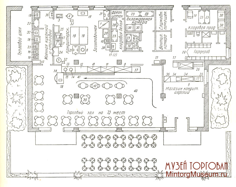1 — пекарский шкаф; 2 — электроплита настольная; з — электрофритюрница; 4 — электрокотёл; 5 — электрокипятильник; 6 — универсальная машина для кондитерских цехов; 7 — холодильный шкаф; 8 — низкотемпературный прилавок; 9 — охлаждаемая наприлавочная витрина, 10 — стол обеденный; 11 — прилавок-витрина для холодных закусок; 12 — прилавок-витрина без охлаждения; 13 — прилавок-витрина для горячих напитков; 14 — термостат; 15 — кофеварка; 16 — кассовый аппарат; 17 — фреоновый агрегат; 18— моечная машина; 19 — стол производственный; 20 — стол-ларь для теста; 21 — стеллаж кондитерский; 22 — стеллаж металлический; 23 — стеллаж; 24 — шкаф для посуды с нитей; 25 — шкаф для приправ; 26 — шкаф буфетный; 27, 28 — шкаф для белья; 29 — шкаф для одежды; 30 — подтоварник; 31 — раковина; 32 — трап; 33 — подставка для сушки посуды; 34 — буфетная стойка; 35 — буфетная стойка с фреоном; 36 — откидной прилавок; 37 — подставка для подносов; 38 — стол для кассира; 39 — стол обеденный; 40 — стулья; 41 — барьер Кафе сезонные создавались в парках, садах, на бульварах, вблизи пляжей и т. д.