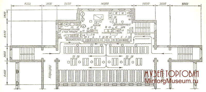 1 — плита огневая; 2 — пищеварочный котел; 3 — электросковорода; 4 — кипятильник; 5 — прилавок для холодных закусок и кондитерских изделий; 6 — прилавок для горячих первых и вторых блюд; 7 — прилавок для горячих напитков; 8 — посудомоечная машина; 9 — универсальный привод; 10 — холодильный шкаф; 11 — фреоновый агрегат; 12 — шкаф для приправ и инструмента; 13 — шкаф для хлеба; 14 — план для посуды с нишей; 15 — моечная ванна; 16 — раковина; 17 — стол для сбора остатков пищи; 18 — стол производственный; 19 — стол для посуды на кронштейнах; 20 — стол для подносов; 21 — стол для приборов и хлеба; 22 — стол с кассовым аппаратом; 23 — стеллаж металлический; 24 — ларь топлива; 25 — стол обеденный; 26 — скамья; 27 — подъёмник