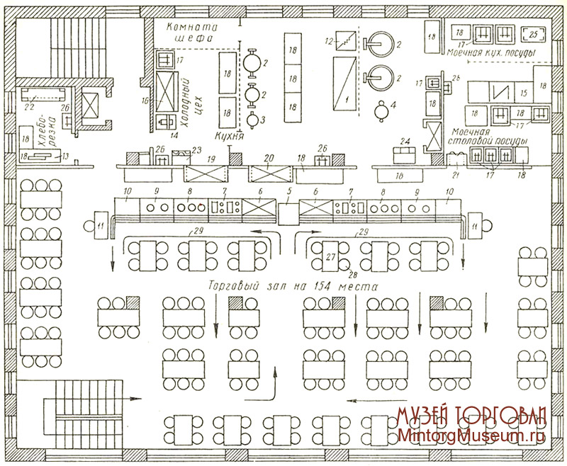 1 — плита огневая; 2 — пищеварочный котел; 3 — электросковорода; 4 — кипятильник; 5 — прилавок для подносов; 6 — охлаждаемая стойка; 7 — электромармит для вторых блюд; 8 — электромармит для первых блюд; 9 — стойка для горячих напитков; 10 — прилавок для приборов и хлеба; 11 — стол для кассира; 12 — жарочно-кондитерский шкаф; 13 — хлеборезка; 14 — универсальный привод; 15 — посудомоечная машина; 16 — холодильный шкаф; 17 — моечная ванна; 18 — стол производственный; 19 — шкаф передаточный с охлаждением; 20 — шкаф передаточный с подогревом; 21 — шкаф передаточный для посуды; 22 — шкаф для хлеба; 23 — шкаф для приправ; 24 — ларь для топлива; 25 — стеллаж металлический; 26 — раковина; 27 — стол обеденный; 28 — стулья; 29 — металлический барьер