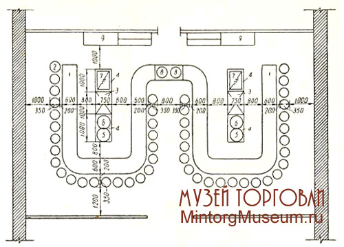 1 — закусочная стойка; 2 — стулья; 3 — холодильный шкаф; 4 — производственные столы; 5 — аппарат для охлаждения молока; 6 — аппарат для охлаждения соков; 7 — электрическая настольная плита; 8 — электрокофеварки; 9 — производственные столы; 10 — буфетные шкафы