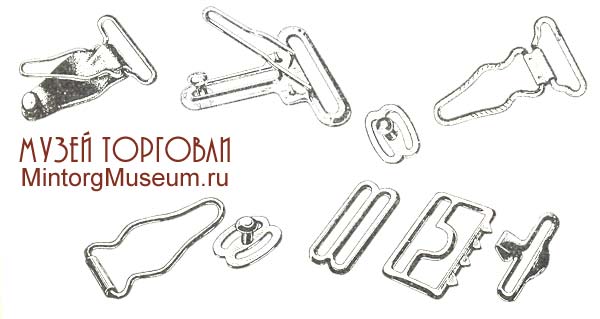 3. Из двух проволочных фигурных рамок (угольников), соединённых обжимом. Рамки таких машинок в большинстве случаев оплетались х.-б. пряжей или шёлковыми нитями. Машинки для мужских подвязок состояли из держателя чулок (такой же конструкции, как первый или второй вид машинок для женских подвязок), крючка, петли и передвижки, позволяющей изменять длину подвязки соответственно объему ноги. Поверхность деталей машинок должна была быть чистой, не иметь заусенцев, вмятин, царапин, острых режущих кромок; заштамповка держателя должна была быть прочной, никелевое покрытие блестящим, равномерным, без отслоений и тёмных пятен.