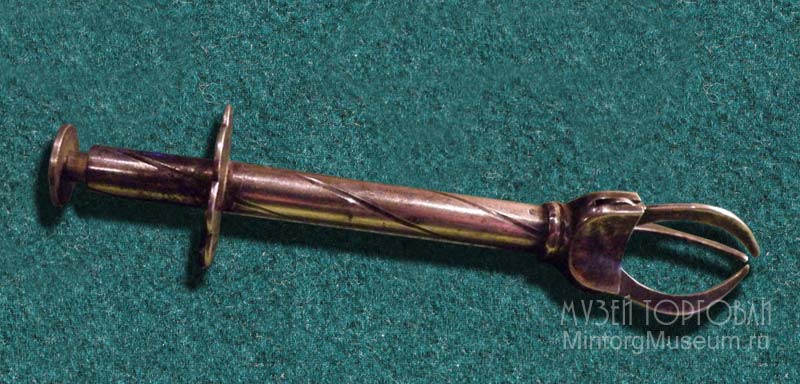 Нажимая большим пальцем на кнопку штока, находящуюся в верхней части трубочки щипцов, можно было привести в действие спиральную пружинку. Пружинка заставляла лапки щипцов сжиматься и при этом захватывался кусочек сахара.
