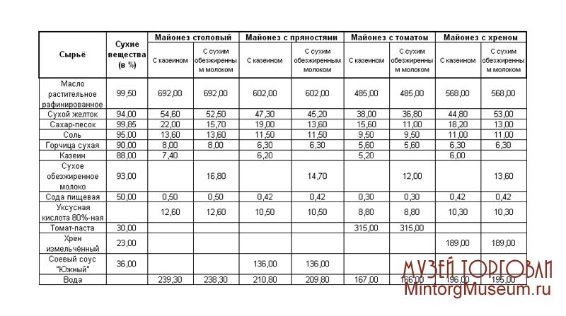 Для изготовления майонеза в СССР пятидесятых годов использовались рафинированные растительные масла (подсолнечное, хлопковое, соевое, арахисовое, кунжутное и др.), уксусная эссенция или уксус спиртовой, сухой желток, свежие куриные яйца или желточный меланж, сахар-песок, соль, казеин или сухое обезжиренное молоко, горчичный порошок, сода питьевая, томат-паста, хрен, соевый соус «Южный». Производство майонеза состояло из составления и приготовления эмульсионной пасты, её смешивания с растительным маслом и расфасовки. В зависимости от состава и использования майонезы бывали следующих видов: столовый, с пряностями, с томатом, с хреном.