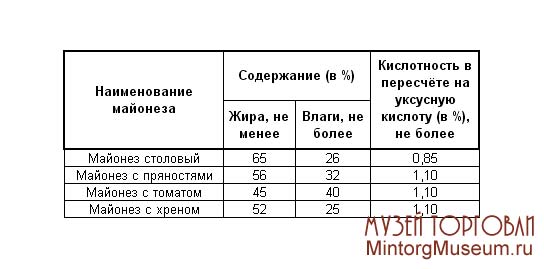 Майонез столовый (провансаль) — характеризовался нежным, маслянистым, слегка кисловатым вкусом, без следов горечи, с запахом специй. По внешнему виду и консистенции напоминал густую сметану. Предназначался для заправки разнообразных рыбных, мясных блюд, закусок, салатов и винегретов.