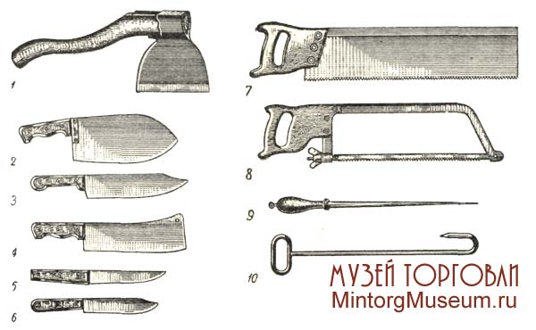 Инструментарий продавца мясных товаров: 1 - тупица; 2 - широкий мясной нож; 3 - нож-рубак; 4 - секач; 5 - обвалочный нож; 6 - нож-телятник; 7-8 - ручные пилы для распила костей; 9 - мусат; 10 - металлический крюк для переноски четвертин и туш мяса
