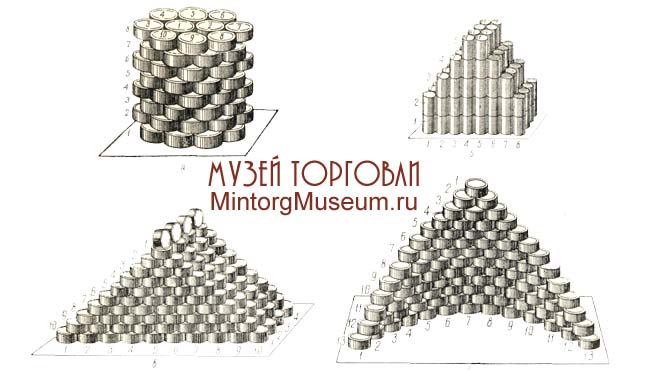 Способы выкладки консервов: а - колонкой; б - банка на банку; в - пирамидой; г - полукругом