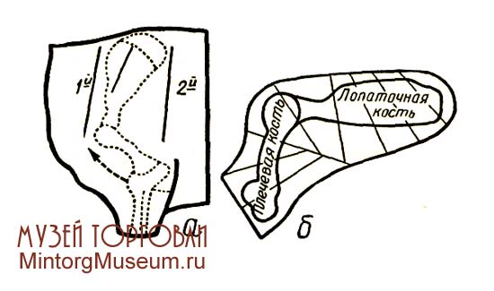 Схема надрезов при отделении и мелкокусковой разруб лопатки: а - 1-й и 2-й надрезы; б - схема мелкокускового разруба