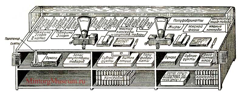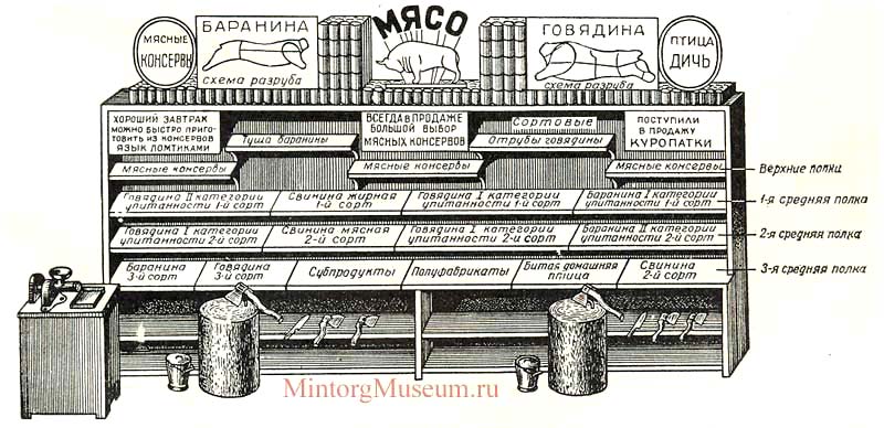 Для торговли мясом было утверждено типовое неохлаждаемое и холодильное оборудование. Холодильное оборудование с автоматическими фреоновыми установками различной конструкции широко применялось в советских магазинах середины прошлого века. Наиболее удобными являлись: охлаждаемая открытая наприлавочная витрина В-3, холодильный прилавок-витрина ЗХПМ, открытый прилавок-витрина ПВ-1, для магазинов самообслуживания — открытый со стороны покупателя прилавок-витрииа ПВ-4 и охлаждаемый прилавок с двухъярусной витриной ПВ-7 (см. Прилавки торговые).