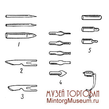 1 — иглы для гравировки по металлу, стеклу и пластмассам; 2 — нож широкий; 3 — нож узкий толщиной до 2,4 мм; 4 — ножи для художественной резьбы но дереву и пластмассе; 5 — бойки для чеканки по металлу; 6 — подставка для изменения глубины резания ножами