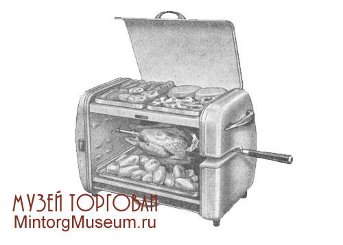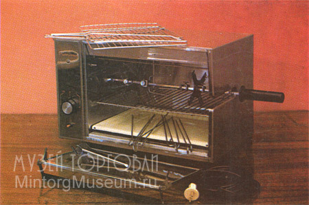 Электрогриль ГЭ-4 для приготовления мясных и рыбных, кулинарных изделий, шашлыков, отбывных, шницелей и кур был популярен в 70--80-е годы. Потребляемая мощность - 1700 Вт.