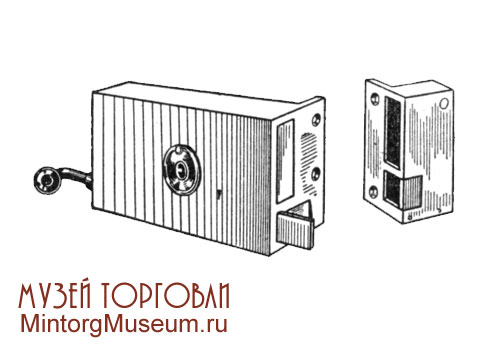 Электрический накладной замок имел два засова: прямоугольный ригельный (одно- или двухоборотный) и подпружиненную защёлку. Оба засова отмыкались ключом снаружи и изнутри, а защёлка (изнутри) также и при помощи оттягивающейся в сторону рукоятки. Ригельный механизм бывал как сувальдный, так и цилиндровый (см. Замки). Дистанционное управление осуществлялось только защёлкой, которая втягивалась электромагнитом внутрь корпуса при замыкании электрической цепи с помощью кнопки. При освобождении кнопки подпружиненная защёлка автоматически запирала замок в момент захлопывания двери. Размеры замка (в мм): длина 90—100, высота 50 — для дверей с узкой обвязкой и длина 110—120, высота 50 мм — для дверей с широкой обвязкой. Замки этого типа бывали также врезные.