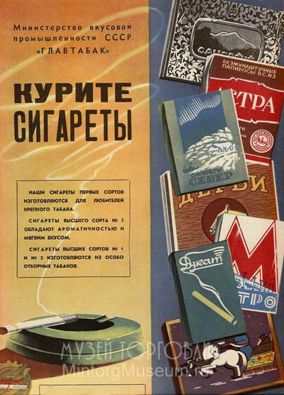 Сигареты - безмундштучные папиросы (нужно учесть, что в пятидесятые годы не у всех сигарет были фильтры, и о них ниже), — табачные изделия, состоящие из безмундштучной гильзы — рубашки (сигаретная тлеющая бумага), заполненной волокном из ферментированных табаков или махорки. В зависимости от ботанического типа сырья сигареты, согласно правилам пятидесятых годов, делятся на три товарные группы: сигареты, из жёлтых табаков, сигареты махорочные (приготовляемые из махорки), сигареты сигарные (приготовляемые из сигарных табаков).