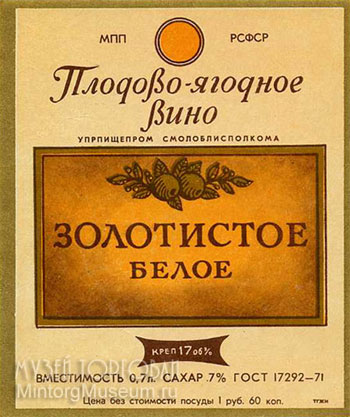 Плодово-ягодное вино "Золотистое" белое (Упрпищепром Смолоблисполкома)