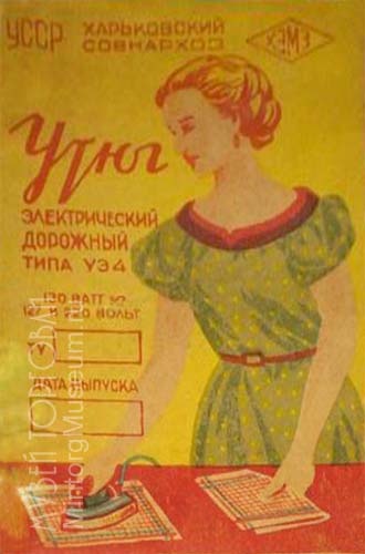 Изображение с упаковки утюга электрического дорожного УЭ4 Харьковского Совнархоза