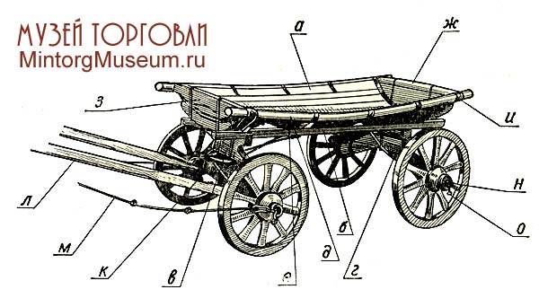 Телега: а — кузов, б — продольный брус; в — передняя подушка; г — задняя подушка; д — круглая грудка кузова; е — полудуга; ж - задний поперечный брус; з — передний поперечный брус; и — металлическая скобка; к — поворотный круг; л — оглобля; м — тяж; н — колпак; о — чека