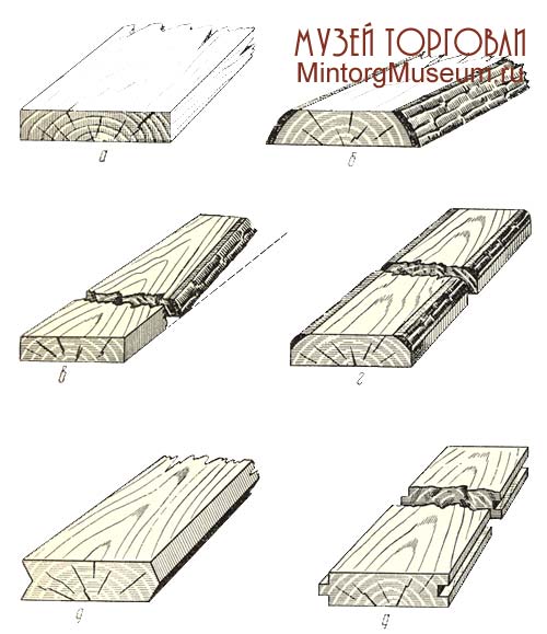 а — обрезная; б — необрезная; в — с острым обзолом; г — с тупым обзолом; д — шпунтованная