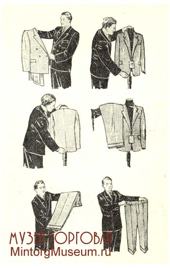 Во всех магазинах и универмагах, торгующих готовым платьем, должна была бесплатно производиться мелкая переделка — укорочение или удлинение низа подола платья, рукавов и низков брюк, перестановка пуговиц и подкладка плечиков. За более крупные переделки взималась плата. При отпуске покупателю одежды нужно было правильно её упаковать. При упаковке костюма складывали втрое брюки и клали на лист бумаги, на них укладывали жилет и сверху пиджак, сложенный по длине вдвое изнанкой наружу, завёртывали в бумагу, перевязывали шпагатом. Шерстяные и шёлковые платья сложных фасонов упаковывали в специальные пакеты или коробки. Пальто упаковывали, выворачивая наизнанку; соединяли борта, укладывали рукава, складывали вдвое или втрое и заворачивали в бумагу. При отпуске готового платья в покупку вкладывалась памятка покупателю по хранению и уходу за готовым платьем.