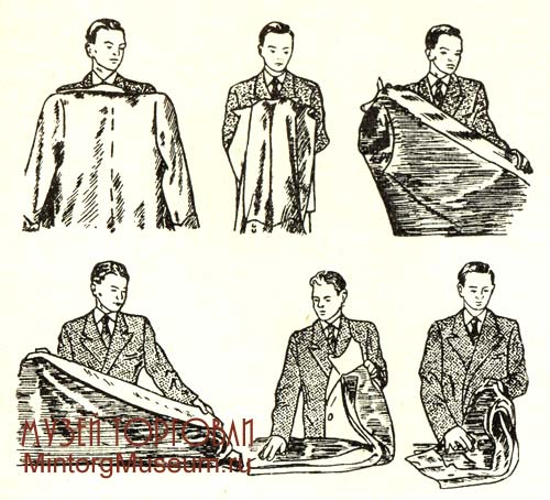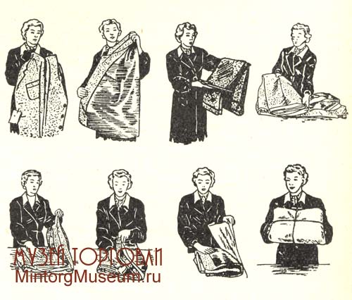 Размещение и выкладка одежды в торговом зале. Готовое платье размещается на рабочих местах прежде всего по группам (мужское, женское, детское), внутри каждой группы по видам (пальто, костюм, брюки и т. п.), по материалу (шерстяные, х.-б., шёлковые), по размерам, а внутри каждого размера — по фасонам (расцветкам) и ростам. Размещение товара в мужской секции начинается с пальто, занимающих обычно наибольшее место, далее размещается полупальто, костюмы, пиджаки, куртки и брюки. Последние три вида изделий, составляющие группу товаров, обычно размещаются рядом. При недостатке места в небольших секциях готового платья внизу шкафа вешают пальто, а вверху — костюмы. В таком же порядке развешиваются товары и в секции женского платья; блузки и юбки вывешиваются в шкафах в два яруса. Ассортимент детского готового платья при размещении в торговом зале подразделяется на три основные группы: пальто, костюмы для мальчиков и платья; каждая из этих групп в свою очередь подразделяется на две подгруппы — для детей дошкольного и школьного возраста. В одной стойке рекомендуется накладывать не более 15 пар х.-б. брюк, не более 10 пар шерстяных и не более 8 пар грубошерстных. Для предохранения белых летних костюмов и платьев от загрязнения на них надевают сверху специальные чехлы из целлофана или отбельной бязи. Готовое платье вывешивают так, чтобы левый рукав был виден покупателю. При размещении платья на рабочем месте обращается внимание на положение рукавов и низа платья. Рукава должны одинаково выступать наружу, образуя сравнительно ровную линию. Отдельными стопками выкладываются брюки двух размеров, на которые представляется наибольший спрос (48 и 50). Брюки размеров 52, 54 и 56 при недостатке места могут выкладываться одной стопкой, но чтобы размер 52, как более ходовой, был сверху, под ним 54 и в самом низу 56. Одной стопкой могут быть уложены брюки размеров 46, 44 и 42, чтобы размер 46 был сверху,а 42 — внизу. Между отдельными размерами обязательно кладется прокладка с ярлыком, указывающим размер. Брюки укладывают на полках ровными стопками без перекосов.