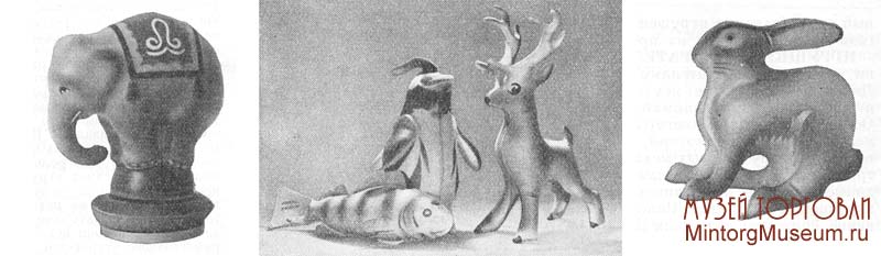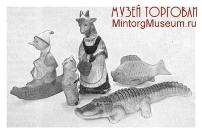 Производство. Вырабатывались резиновые игрушки главным образом трёх типов: формованные — полые, рельефные игрушки, изготовляемые методом формования в специальных прессформах; маканые — эластичные тонкостенные игрушки, изготовляемые из резиновых клеев на фарфоровых моделях методом макания, и надувные плоской формы; изготовляемые из листовой резины методом штамповки и принимающие объёмную форму при надувании их воздухом. Кроме указанных видов резиновых игрушек, выпускались детские резиновые мячи различных размеров, мячи для игры в лапту, а также резиновые воздушные шары.