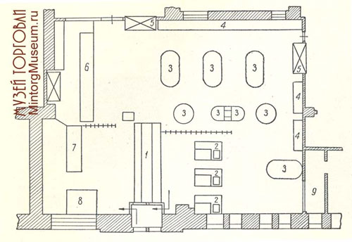 1 - стойка корзинщиц; 2 - кабины контролёров-кассиров; 3 - островные горки; 4 - пристенные горки; 5 - охлаждаемые открытые прилавки-витрины; 6 - прилавок обслуживания; 7 - прилавок по продаже штучных товаров; 8 - прилавок "Соки-воды"; 9 - кабинет директора