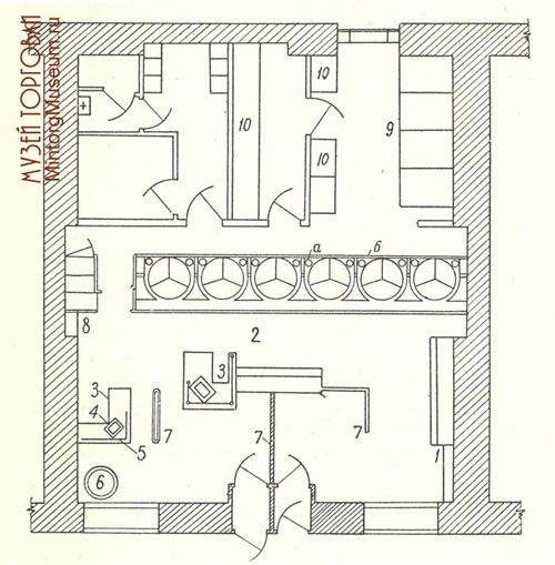 1 - горка; 2 - вращающийся шкаф; 3 - кабина контролёра-кассира; 4 - кассовый аппарат; 5 - стеклянные ограждения; 6 - стол для упаковки товаров; 7 - направляющий барьер; 8 - контрольные весы; 9 - контейнер для хранения хлеба; 10 - полочный стеллаж: а - люминисцентные лампы для освещения шкафов. б - раздвижные дверцы шкафов