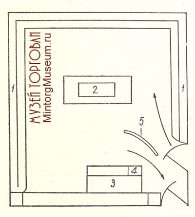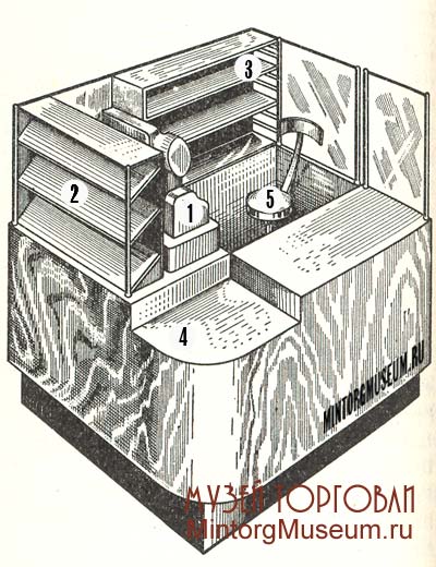 1 - кассовый аппарат; 2 - витрина для образцов товаров; 3 - полки для запаса товаров; 4 - выемка для корзины с товаром; 5 - вращающийся стул для контролёра-кассира