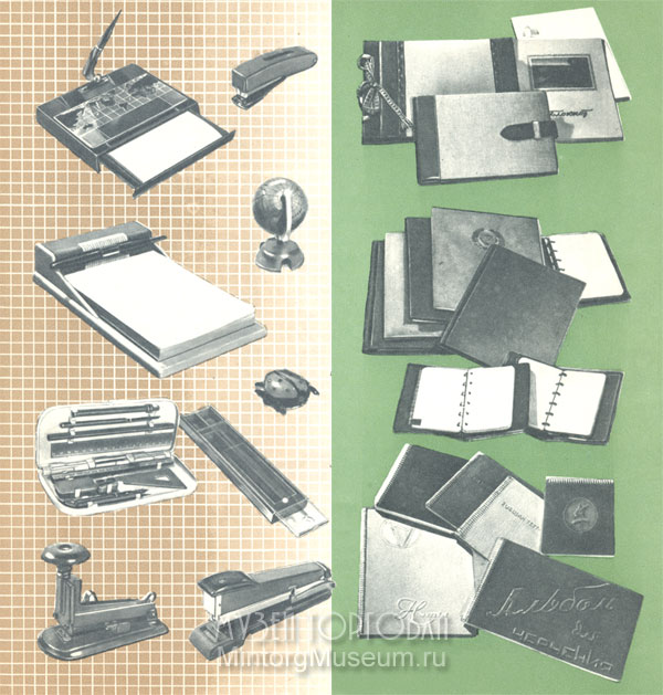 Бумажно-картонные канцелярские товары: бумага копировальная (копирка), восковка, бумага настольная, бумага промокательная, бумага для множительных аппаратов, бумага писчая потребительская, бумага для пишущих машинок, блокноты, бювары настольные, книги алфавитные, книги канцелярские, книги разносные, обложки, папки для бумаг, скоросшиватели, регистраторы и т. д. В настоящее время ассортимент расширен и некоторые ранее имевшиеся в употреблении предметы исключены.