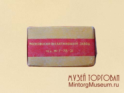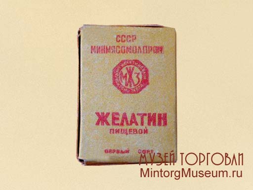 Желатин пищевой измельчённый упаковывался насыпью в фанерные бочонки ёмкостью до 50 кг, выложенные белой плотной бумагой, пергаментом или снабжённые 2—4-слойными бумажными мешками. Расфасованный измельчённый пищевой желатин выпускался в бумажных коробках, снабжённых внутренними пакетами из подпергамента или белой бумаги, весом 25 и 50 г, а также в белых бязевых мешках или картонной упаковке весом до 5 кг. Листовой пищевой желатин выпускался в пачках весом до 0,5 кг.